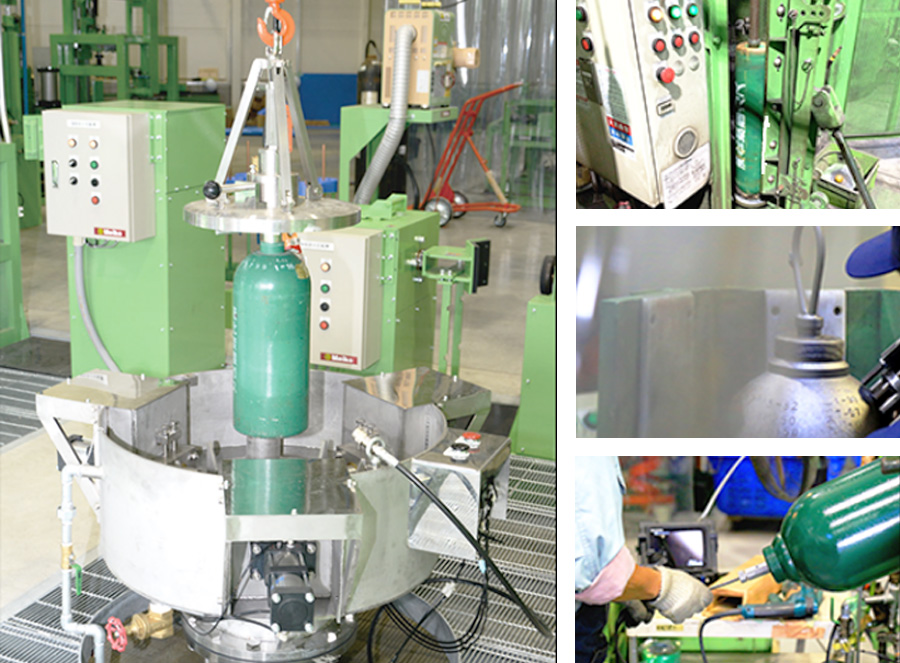 高圧ガス保安法に基づき5~6年に一度再検査を行い、新品同様の容器にして再出荷をしております。